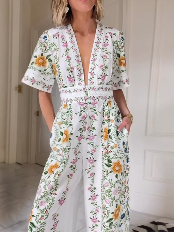NEW🔥 V Neck Floral Elastic Waist Jumpsuit- Tax Free