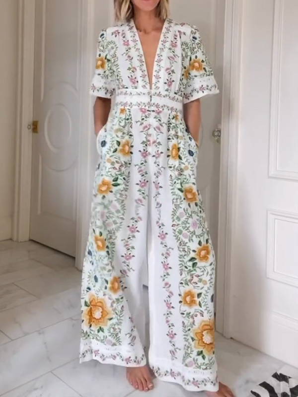 NEW🔥 V Neck Floral Elastic Waist Jumpsuit- Tax Free
