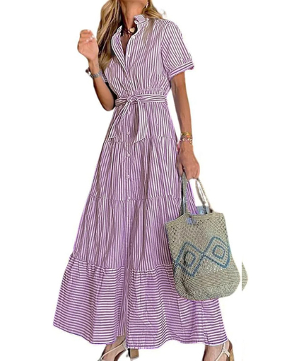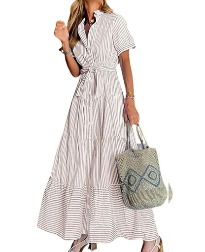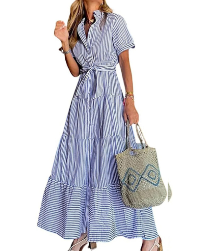 Womens Casual Short Sleeve Button Down Tie Waist Ruffled Striped Maxi Shirt Dress(Buy 2 Free Shipping)